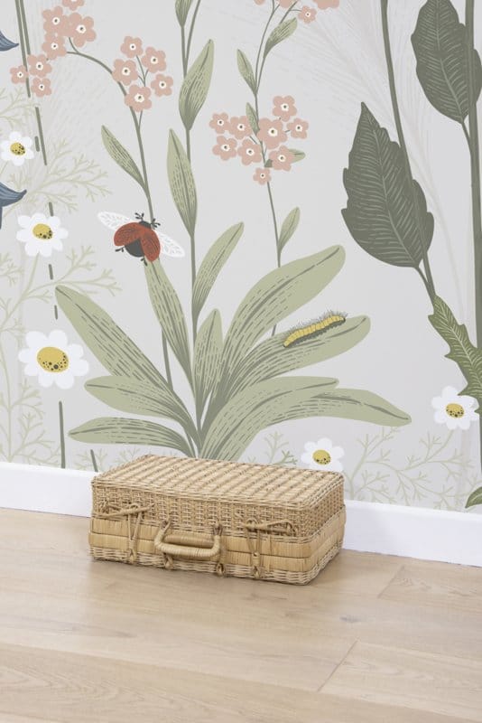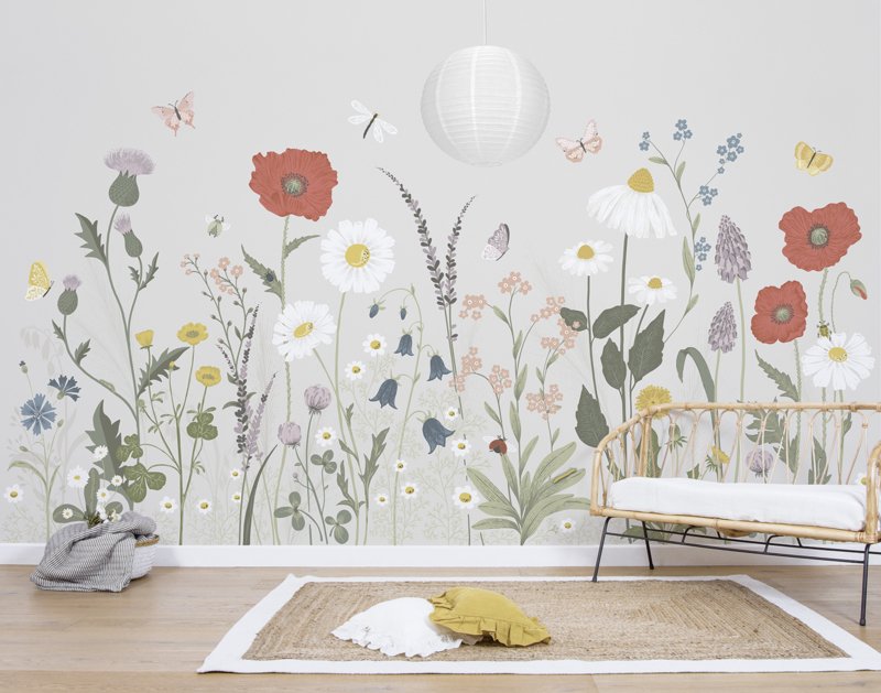 Prachtig behang met Wilde Bloemen uit de Countryside serie van het Franse merk Lilipinso. Droom lekker weg in je kamertje met de prachtige wilde bloemen, vlinders, kevers en torretjes. Een prachtig thema in de baby- en kinderkamer. Voor een uniek kamertje in vrolijke kleuren. Alsof je wakker wordt op het platteland !